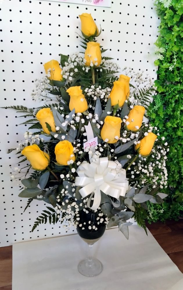 Motivo de 12 rosas en copa complementada con follajes, ilusión y moño