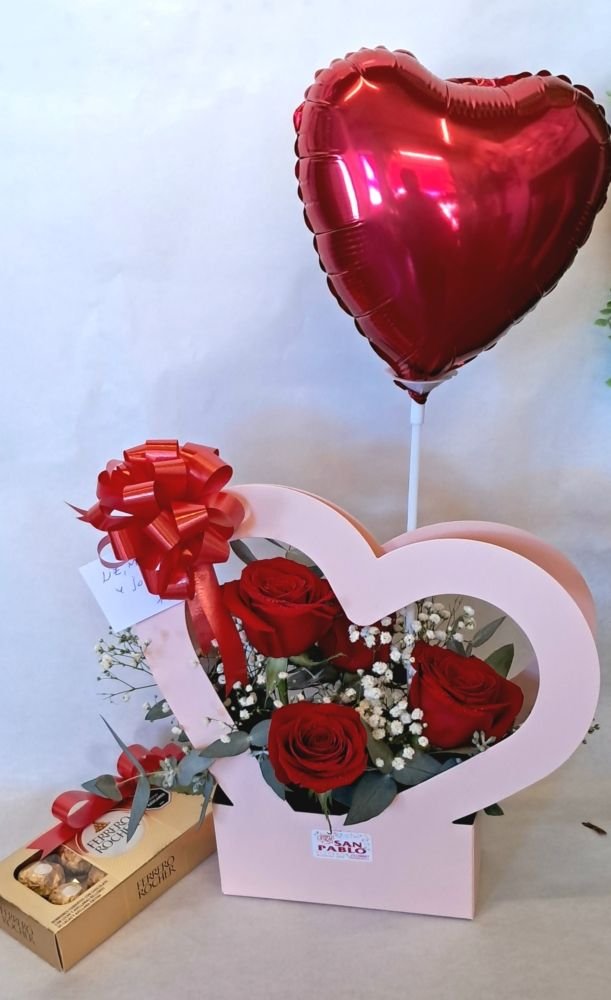 Cesta en forma de corazón con 4 rosas y globo + caja de 8 bombones ferrero rocher.