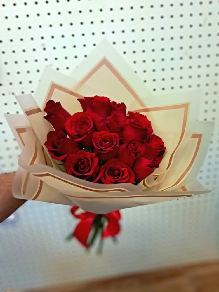 15 rosas finamente arregladas. Color a elección,.Imagen ilustrativa, El color de las flores, al igual que follajes, envoltorio y accesorios quedan sujetos a disponibilidad al momento de la compra. Consulte