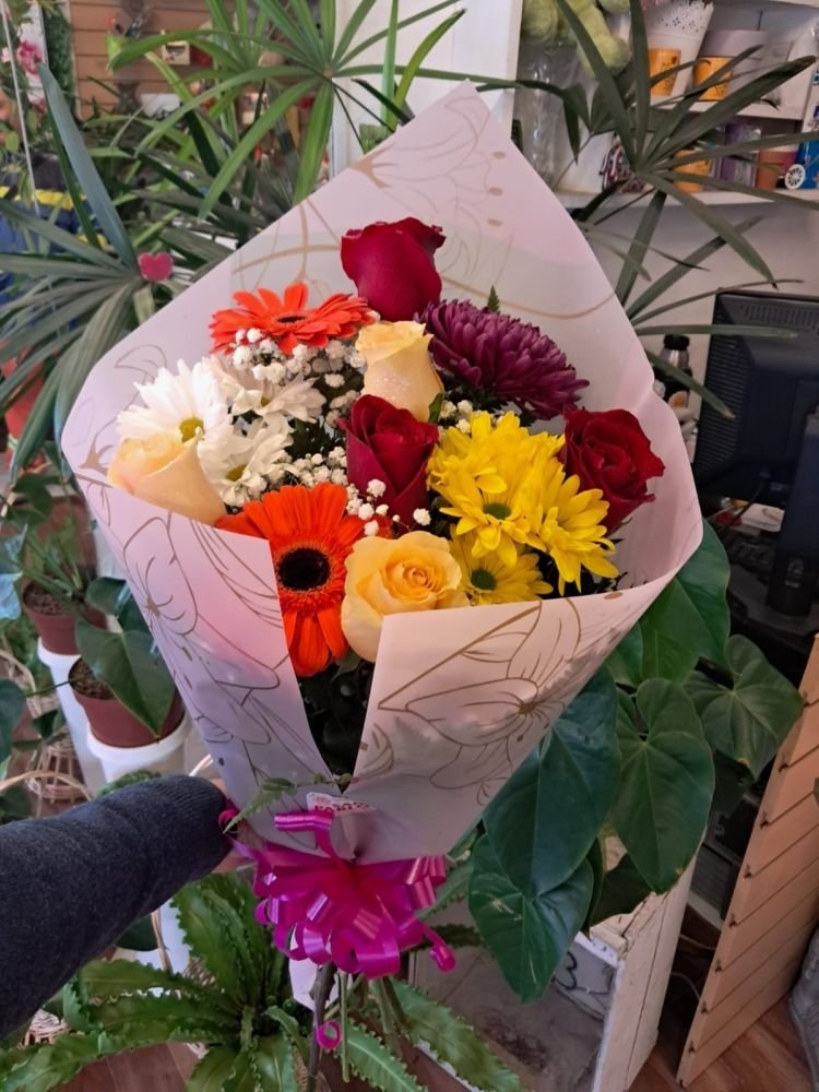 Ramo de 6 rosas, gerberas, felpilla y crisantemo